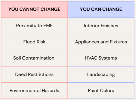 You can change your countertops, upgrade your HVAC, and repaint every room. But you cannot move away from a cell tower, relocate high-voltage power lines, change your flood risk, or remediate contaminated soil without extraordinary expenseβif it's even possible at all.